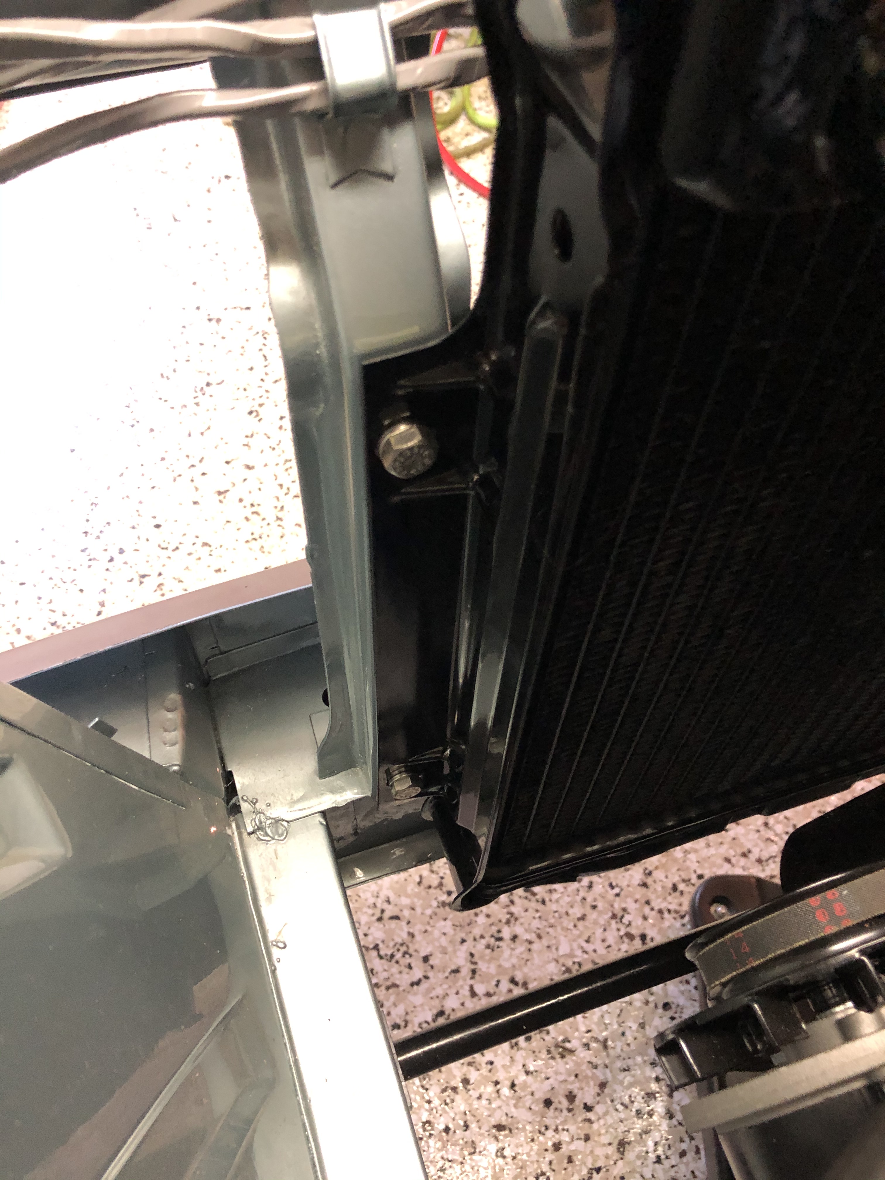Reconditioned radiator installed with new bolts.