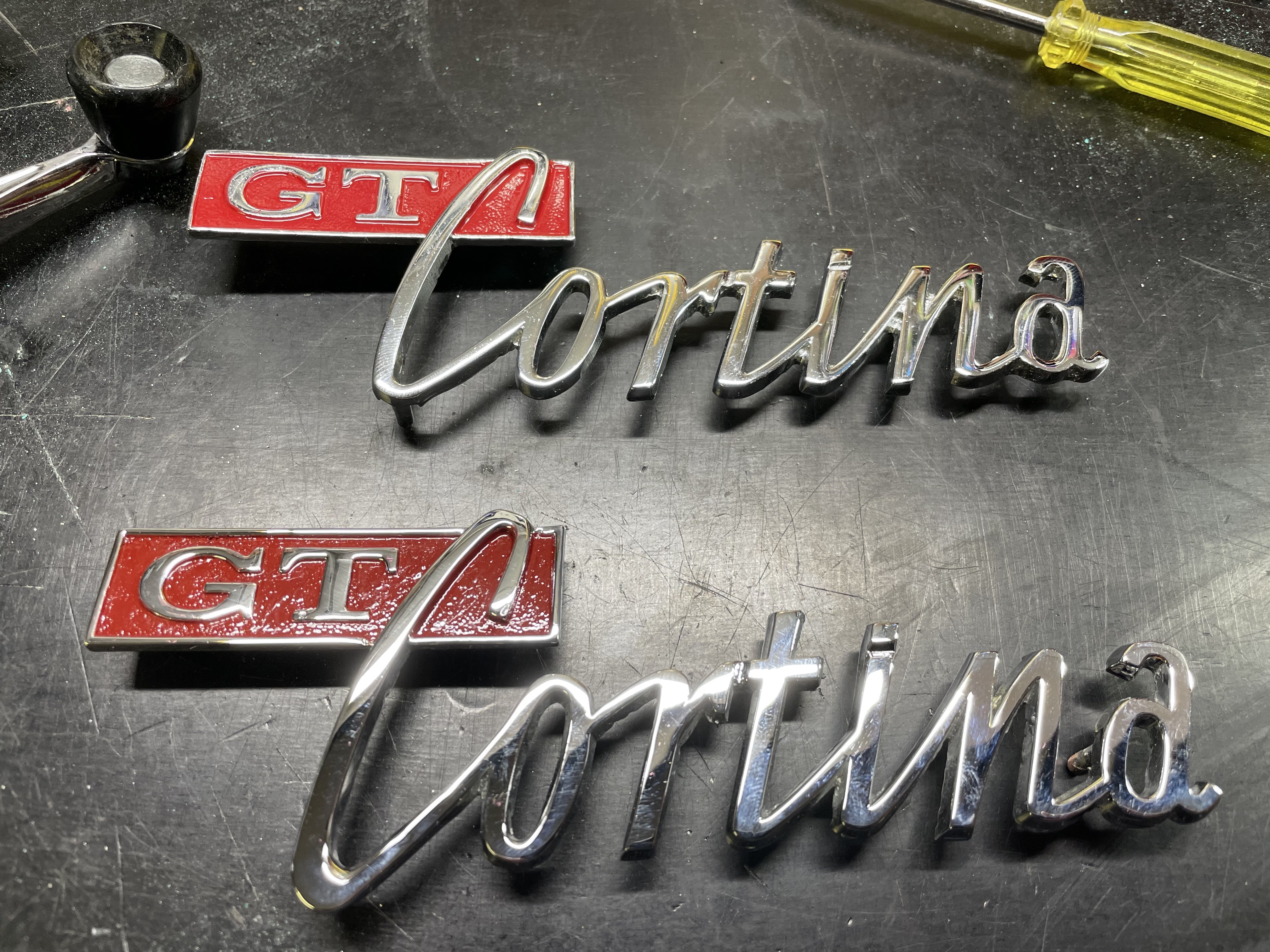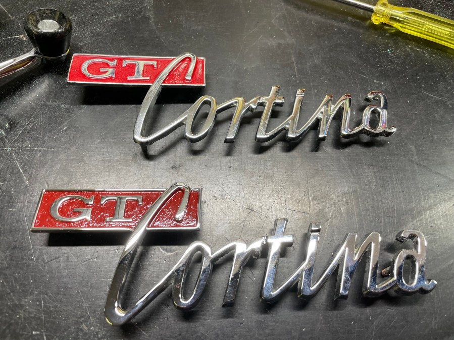 Original badge at the bottom was repaired, rechromed and repainted. The top one is a new repro.